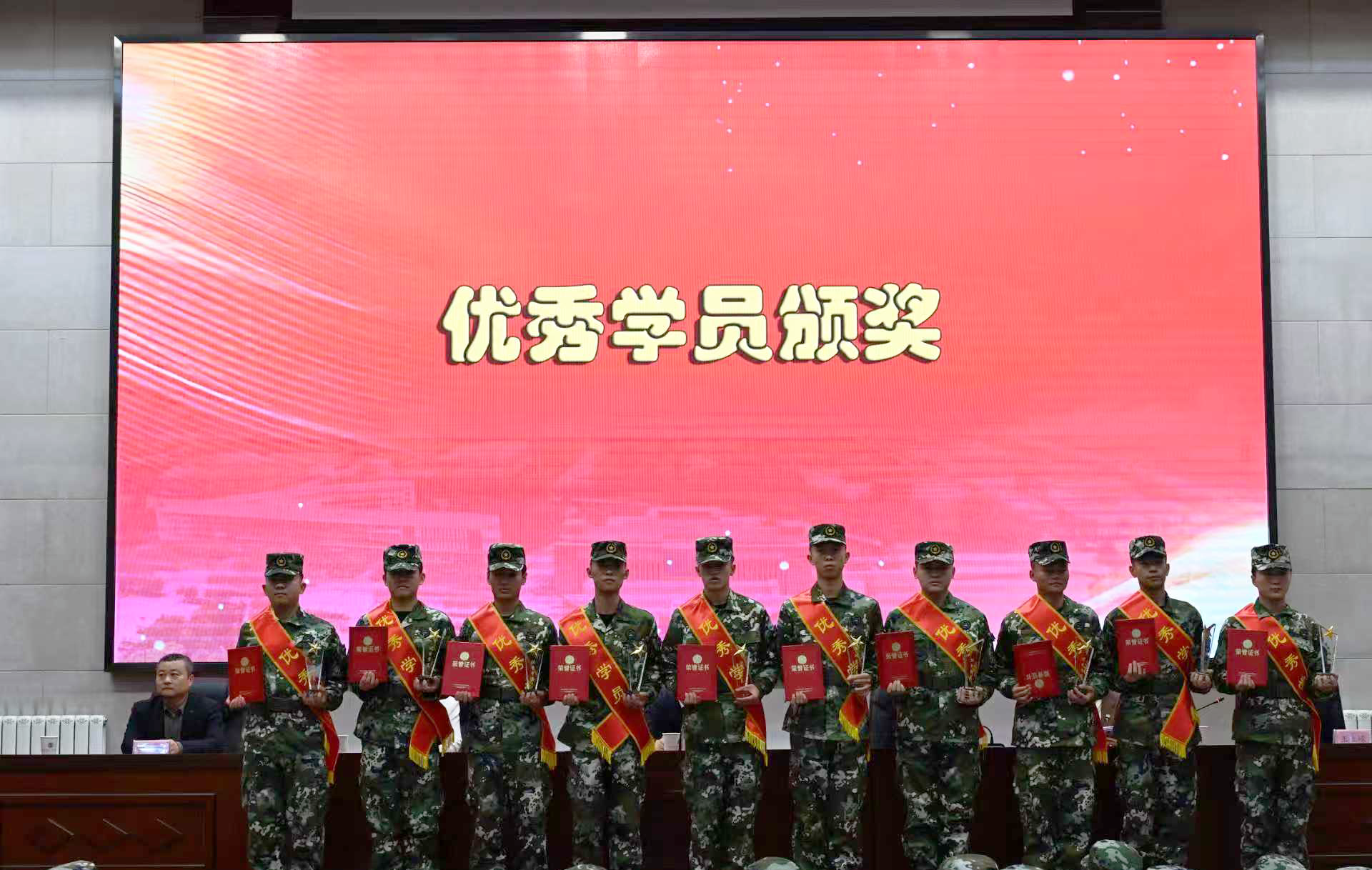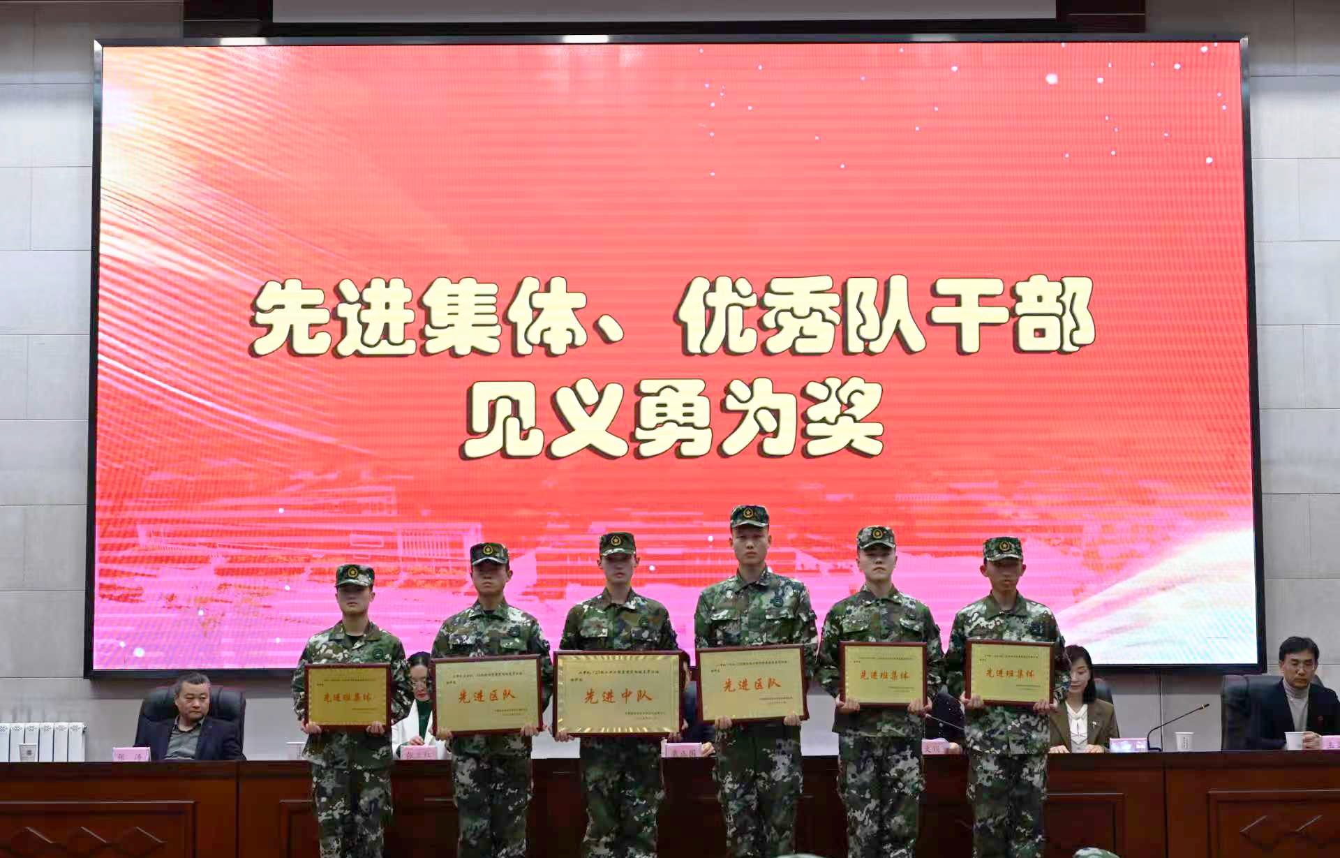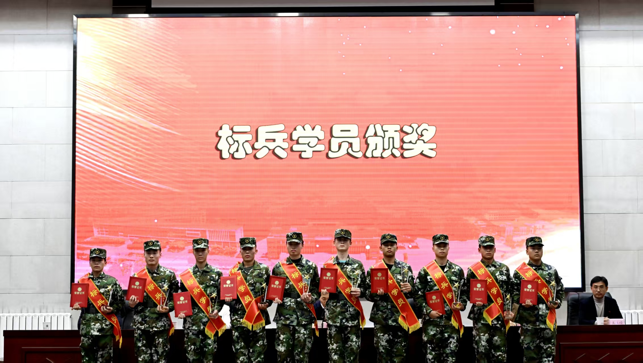 与会领导为获奖的先进个人和集体颁发荣誉证书和奖牌。获奖代表们军容严整,精神抖擞,依次上台领奖,展现了新时代定向培养军士过硬的综合素质和昂扬的精神风貌。