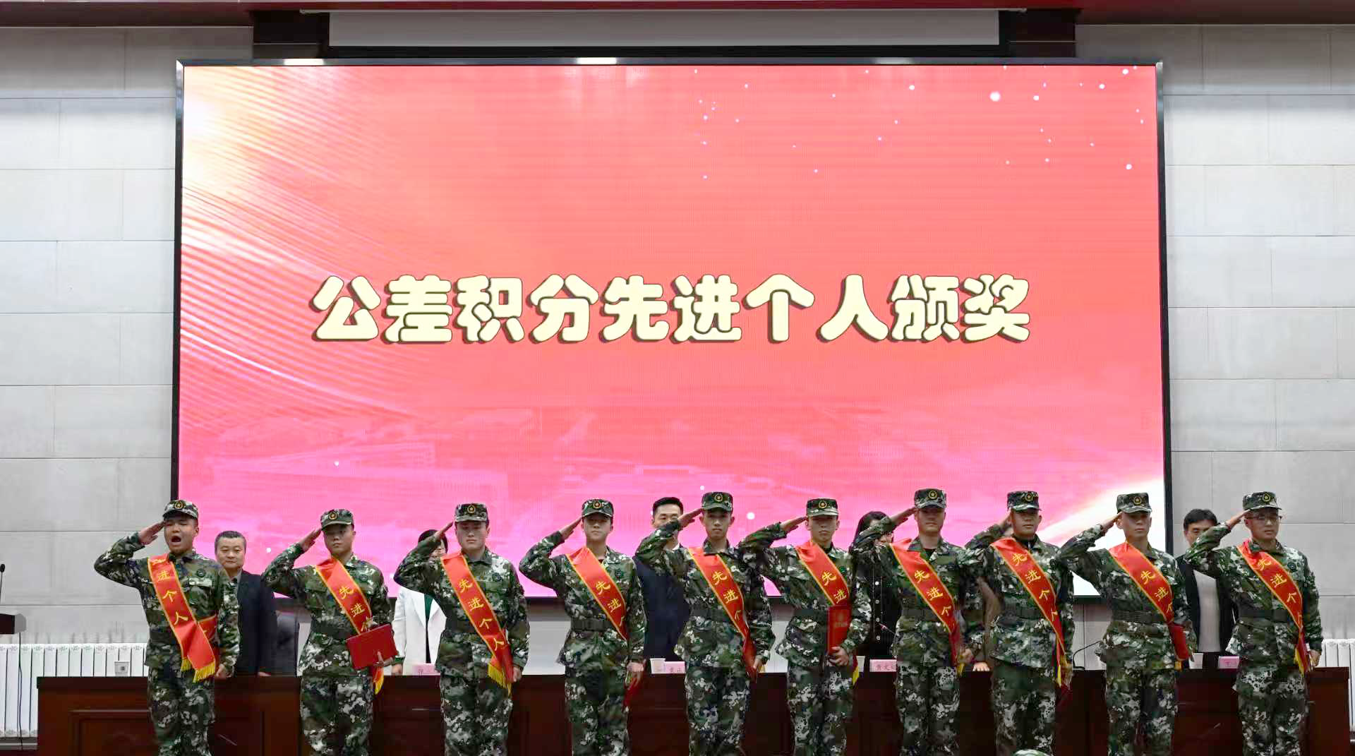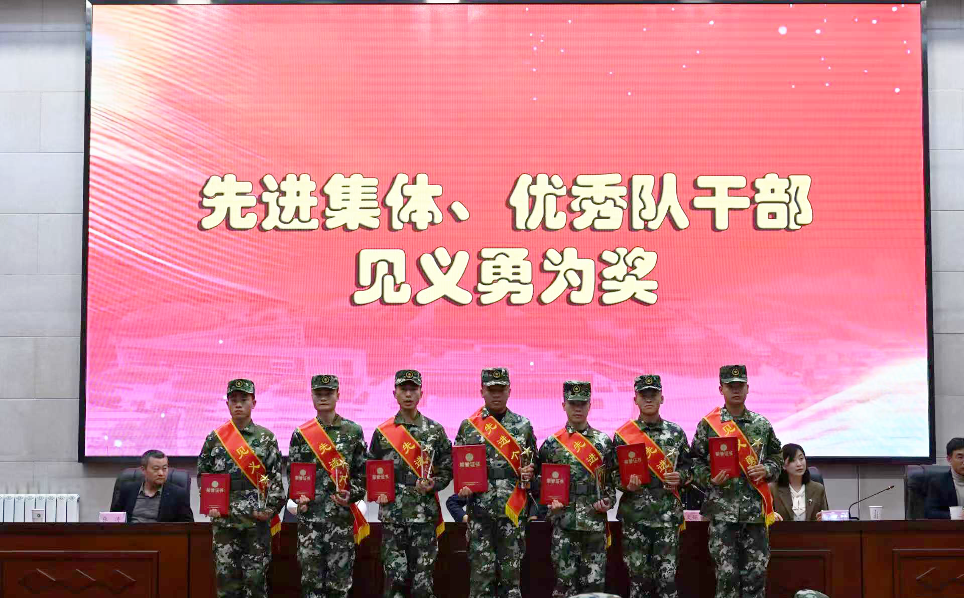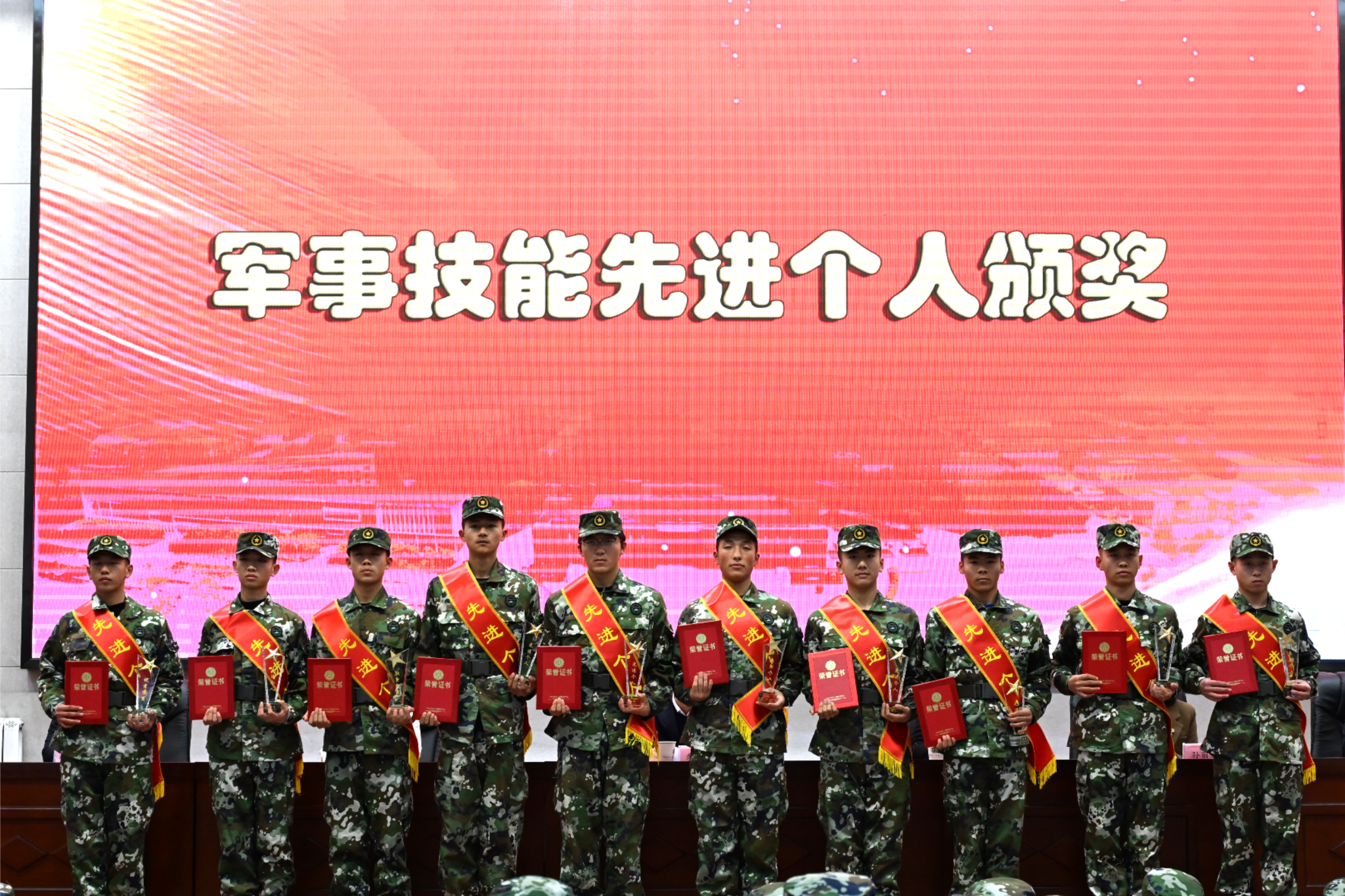 与会领导为获奖的先进个人和集体颁发荣誉证书和奖牌。获奖代表们军容严整,精神抖擞,依次上台领奖,展现了新时代定向培养军士过硬的综合素质和昂扬的精神风貌。