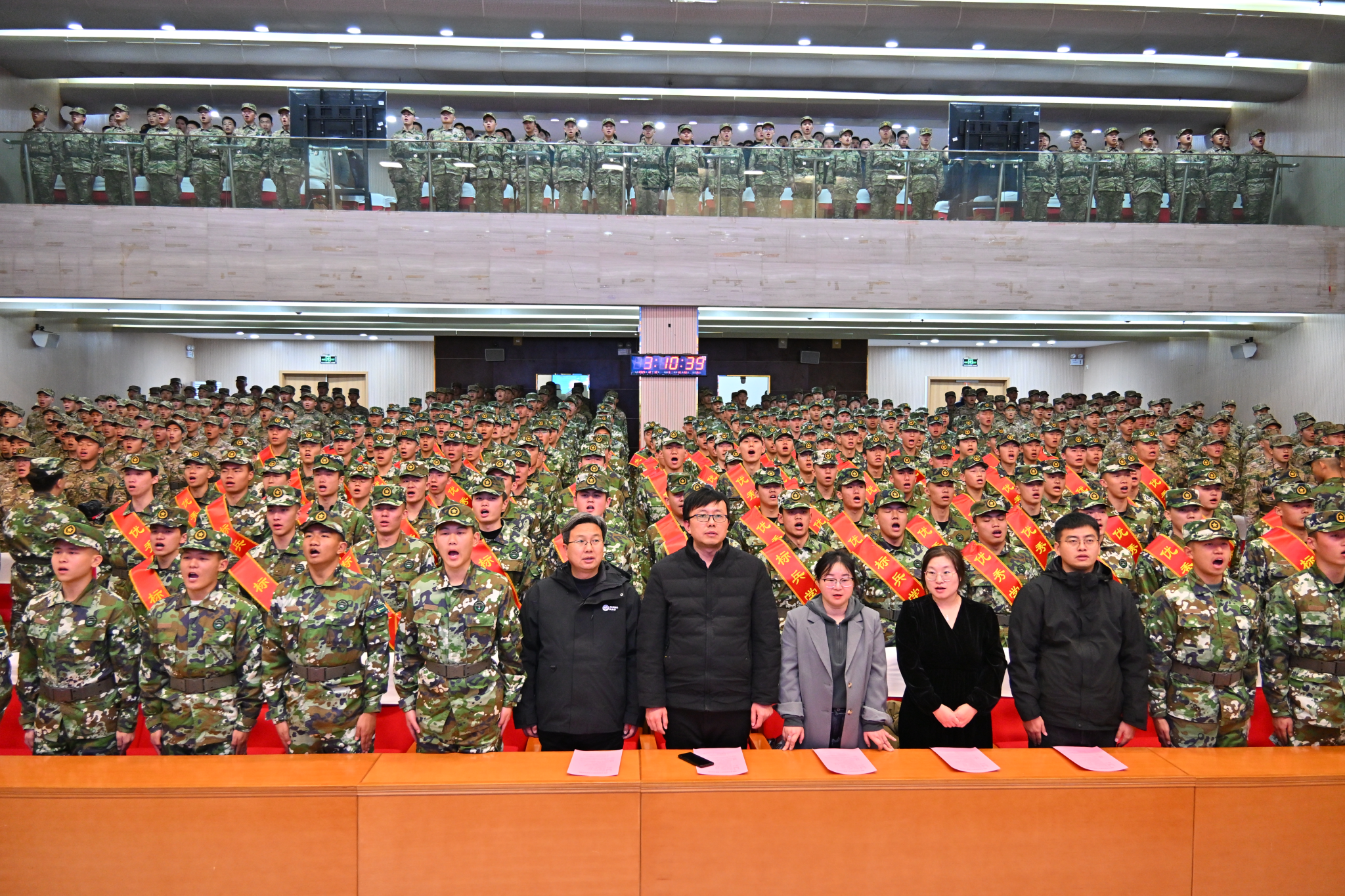 报告厅内军歌嘹亮、氛围热烈。大会在雄壮的《中国人民解放军军歌》中拉开帷幕。