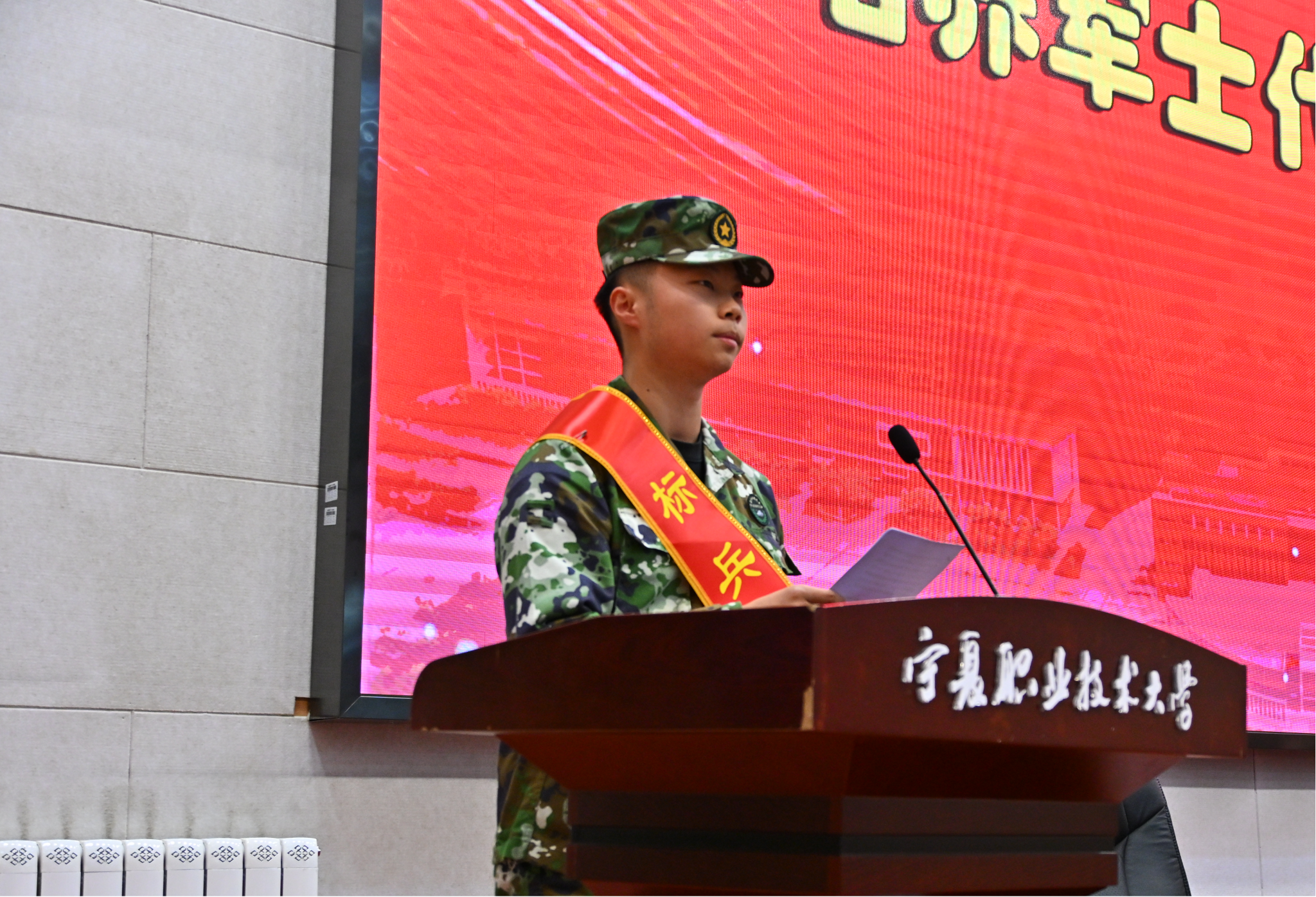 表彰环节结束后,获奖军士代表软件学院2023级学员黄椿敏同学作了发言。他结合自身学习训练经历,分享了成长体会,表达了对学校培养的感恩之情,并代表全体定向培养军士庄严承诺:一是坚决做到坚定信念、不忘初心、牢记使命,打牢从军报国的思想基础;二是坚决做到刻苦学习、勇于担当、锐意进取,练就能打胜仗的专业本领;三是坚决做到服从命令、听从指挥、攻坚克难、勇于拼搏,传承好宁夏职业技术大学定向培养军士的好作风;四是坚决把自己锻造成为有灵魂、有本事、有血性、有品德的“四有”优秀军士人才。